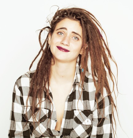 白い背景のドレッドヘアの髪型面白い陽気な顔で本当白人女性 の写真素材 画像素材 Image